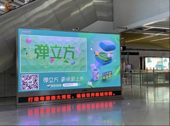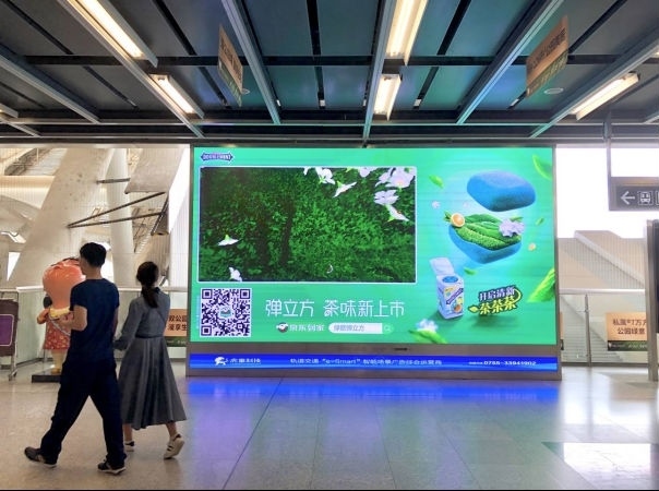 虎童科技作为深圳地铁全线首创体感互动智能传播的广告运营商,独家开发的智能大屏面积占据地铁客流要道,4k高清画质及16:9影像画面比例使绿箭“弹立方”的“弹”与“茶香”展现得灵活灵现,使“弹力十足”的清新茶香几乎溢出画面,脱框而出。