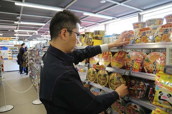 在日本横滨,工作人员在整理方便面食品货架。新华社资料图