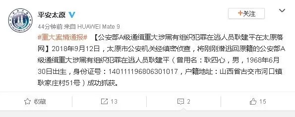 2018年9月12日,太原市公安机关经缜密侦查,将刚刚潜逃回原籍的公安部A级通缉重大涉黑有组织犯罪在逃人员耿建平成功抓获。