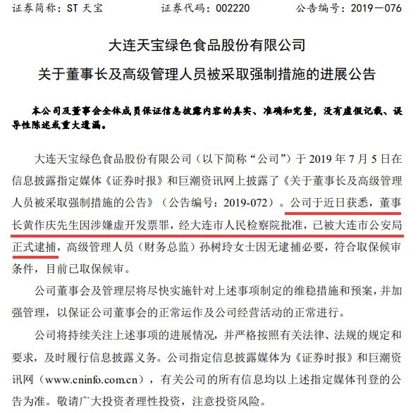 7月29日,ST天宝公告称,董事长黄作庆先生因涉嫌虚开发票罪,经大连市人民检察院批准,已被大连市公安局正式逮捕。