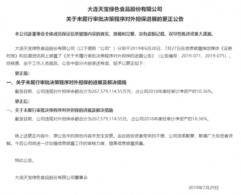 除虚开发票之外,黄作庆及ST天宝亦另有官司缠身。7月29日,ST天宝还披露了《关于未履行审批决策程序对外担保进展的更正公告》。更正后,在关于未履行审批决策程序对外担保的进展及解决措施一款中,截至目前,公司违规对外担保余额合计为267,579,114.55元,占公司2018年度经审计净资产的10.36%。