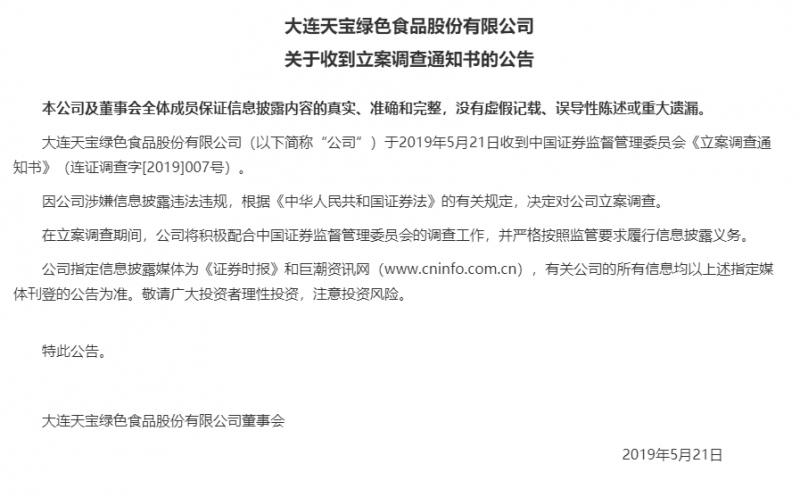 一系列违规事项,也引发了监管部门的高度重视。5月22日,ST天宝公告称,收到中国证监会《立案调查通知书》,因公司涉嫌信息披露违法违规,证监会决定对公司立案调查。天宝食品亦被ST。