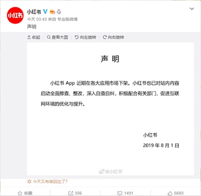 关于这次毫无预兆的下架事件,外界普遍猜测是因其内容违规所致。8月1日凌晨,小红书公司就APP在各大应用市场下架一事在官方微博发表声明,已对站内内容启动全面排查、整改,深入自查自纠,积极配合有关部门,促进互联网环境的优化与提升。