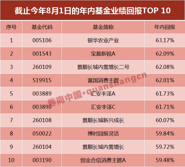 Wind数据披露的信息显示,今年前七个月内,主动股票型基金的前十强基金几乎清一色将农业股列为重仓股,并且位居业绩前列的基金中还包括多只农业主题基金,其中银华农业产业基金夺取了今年前七个月的业绩冠军。