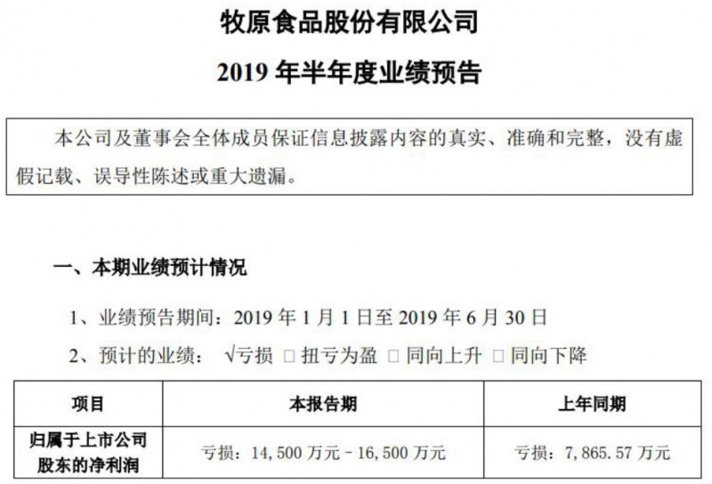 基金经理重仓的农业股已经涨到让很多投资者艳羡不已,更令许多投资者不能接受的是,就算有些农业股半年报业绩亏损,但是股价涨起来那也绝不含糊,比如牧原股份。根据牧原股份发布2019年半年度业绩预告,上半年归属于上市公司股东的净利润亏损1.45亿至1.65亿。