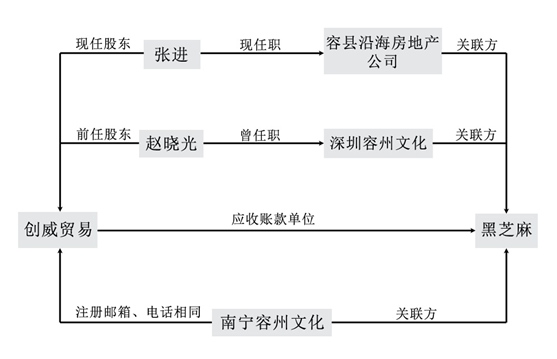 然而工商资料显示,创威贸易由自然人“张进”全资持有。张进是谁?除了创威贸易的股东外,他的另一个身份是“广西容县沿海房地产开发有限公司”(下称“容县沿海房地产公司”)的经理。黑芝麻2017年、2018年年表均显示,容县沿海房地产公司,为上市公司黑芝麻“同一实际控制人控制的企业”,属于关联方。