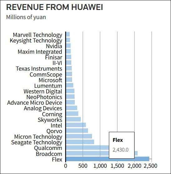 彭博社统计的数据显示,仅去年第三季度,伟创力就从华为获得了24.3亿元人民币的收入,是从华为获利最多的美国供应商,这部分收入约占其当季总营收的5%。