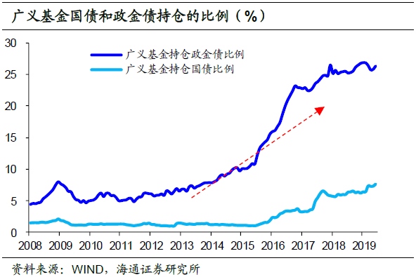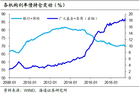 广义基金持仓利率债的比例趋于稳定。2017年开启了金融去杠杆时代,货币政策收紧、金融监管趋严,金融机构负债端的压力普遍上升。其中广义基金方面,由于资管新规对表外理财等资管产品的限制,导致其规模趋于收缩。但同时货币基金等产品规模出现上升,因此广义基金债市的持仓比例虽然结束了上升势头,但整体依然保持稳定,例如广义基金的持仓利率债的占比基本保持在16-17%左右。此外券商利率债的持仓占比稳定在1%左右,保险稳定在7%左右。