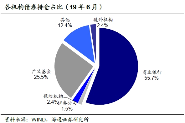 本期专题我们主要探讨债市持仓,尤其是利率债持仓的结构变化。以银行间债市为数据样本,截至19年6月,银行间市场(中债登+上清所)债券托管总规模82万亿,其中商业银行持仓总量45.8万亿,占比55.7%;广义基金持仓21万亿,占比25.5%,此外保险和境外机构持仓分别占比2.4%,券商持仓占比1.5%,这5大机构基本构成了债市主要的持仓机构。