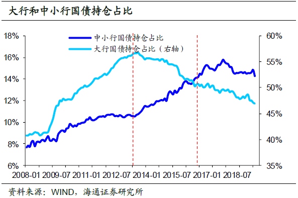 银行持仓利率债占比下降,大行和中小行开始分化。银行方面,13年之后外汇占款流入减少,降准、公开市场操作等成为货币投放的主要手段,负债端稳定性明显减弱;而随着影子银行的快速发展,居民存款出现外流,导致银行存款增速下降,负债端压力上升。商业银行的资产增速从13年开始出现小幅回落,对债券的增持力度也有所下降,其中利率债持仓占比从13年的75%左右下滑至16年的65%左右。而且这一阶段大行和中小行开始分化,其中大行的资产增速和利率债持仓均迎来下行拐点;但中小行得益于同业业务的蓬勃发展,进入主动扩表时期,资产增速依然维持高位,对利率债的持仓也继续增加。