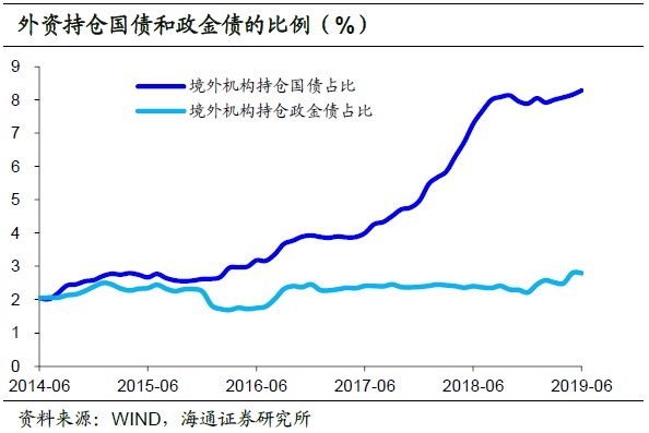 境外机构成为利率债市场的增持主力。在银行配置力量继续减弱,非银持仓上升势头趋缓的背景下,境外机构逐渐成为债市持仓的重要力量。其中境外机构持仓利率债的比例从17年初的3%左右上升至19年6月的5.4%左右,国债的持仓比例更从17年初不足4%上升至19年6月的8.3%左右。在18年至今国债的净增量中,有30%是由境外机构增持的,这一比例仅次于银行(40%左右),远高于广义基金等非银机构。