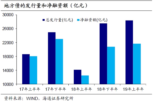 2)地方债发行高峰已过,供给压力减缓。19年上半年银行表内对利率债,尤其是国债的配置力度明显减弱,一个重要的原因是地方债发行放量,挤占了表内的配置额度。由于今年地方专项债发行提前,导致上半年地方债的供给规模明显高于历年同期。截至7月26日,19年内地方债发行3.4万亿,净融资2.6万亿。而根据我们的测算,在不额外新增专项债发行额度的情况下,8-12月地方债的剩余发行量或仅在1万亿左右,明显低于17年和18年同期(1.6-1.9万亿左右)。因此,下半年地方债的供给压力减弱,会释放出银行表内的配置空间。
