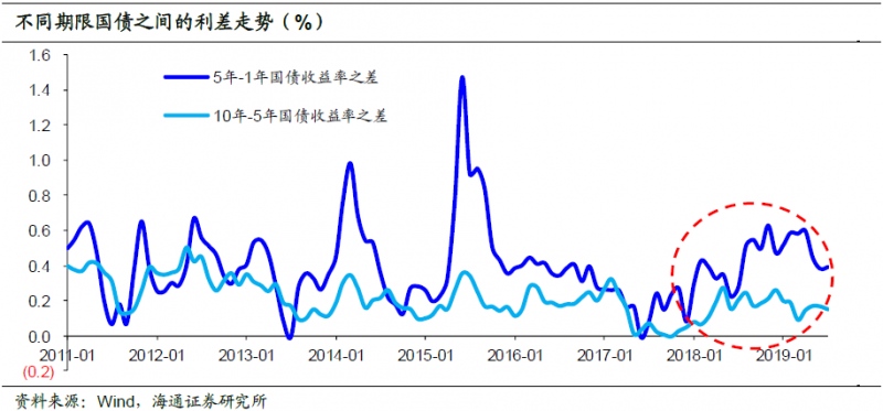 1)利率曲线形态变化,中久期(5年左右)国债利率下行受阻。我们对比10年-5年国债利差和5年-1年国债利差可以发现,13年以来二者之间走势有所分化。尤其是18年以来,10年-5年国债利差下行至低位,目前仅有15BP左右;但5年-1年国债利差依然高位震荡,目前在40BP左右。由于5年左右的国债的持仓主要来自银行表内的配置盘,而长端的10年国债由于交易更活跃,利率的涨跌多由交易盘资金推动。因此,目前利差的分化或表明银行的配置力量仍相对较弱,收益率曲线中段(5年左右)的国债利率下行受阻,导致5年-1年利差难以压缩,制约长端利率的下行。