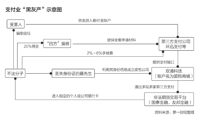 数量众多的皮包公司背后,是一个庞大的“黑灰产”。第一财经记者经过数月的调查发现,在形形色色的“四方”、“支付接口”QQ群里,活跃着一批掮客,他们为不法分子和持牌照的第三方支付机构牵线搭桥,收取资金过路费,获取惊人暴利。