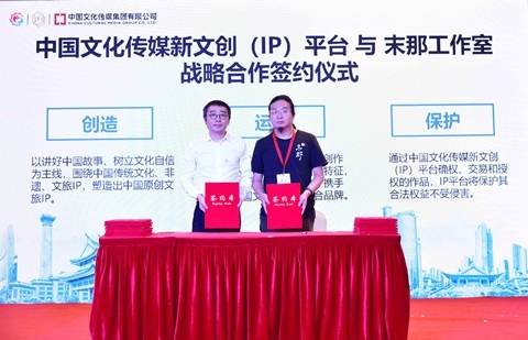 签约环节,中传新文创(IP)平台分别与末那工作室、伴乐谷就相关文旅衍生产品的创作、推广、销售签署战略合作协议。签约双方将以讲好中国故事、树立文化自信为主线,围绕中国传统文化、非遗、文旅IP,与世界各地优秀的艺术家和内容创作者共同提炼清晰的文化特征,塑造出中国原创文旅IP,活化出优质的旅游产品,携手打造能够代表中国的文旅衍生品联合品牌。