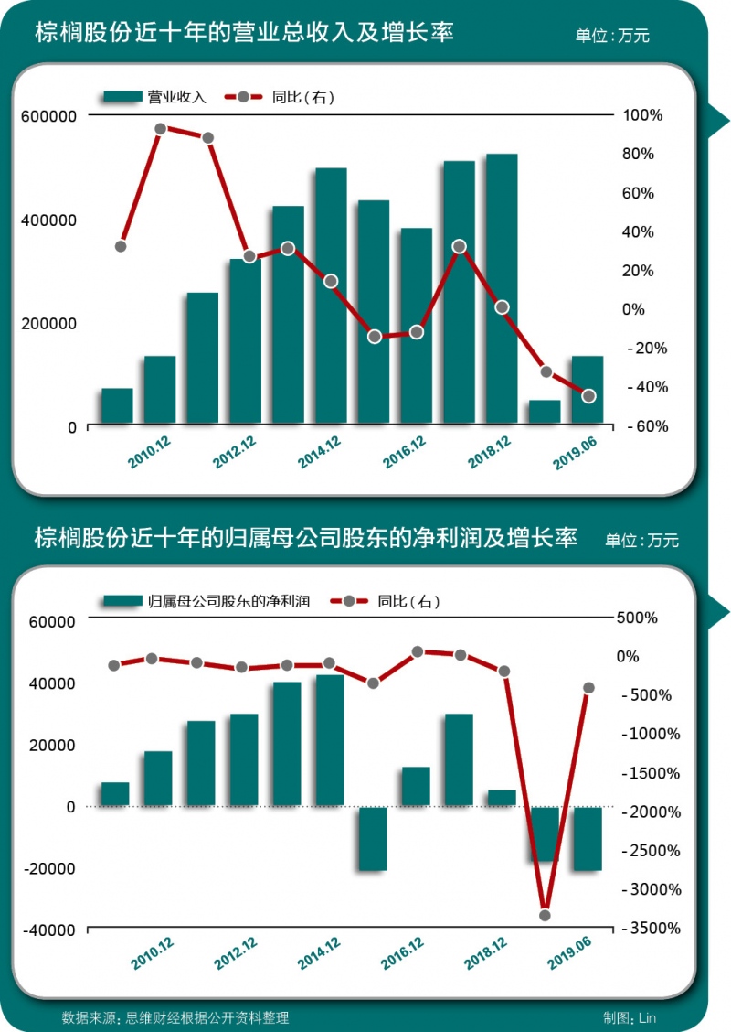 日前,棕榈股份发布《2019年半年度成绩快报》,称在陈述期内的运营收入为13.13亿元,同比下降44.16%,归母净利润由去年同期的1.07亿元下降为亏本1.9亿元,公司呈现了上市9年以来的初次中报亏本。