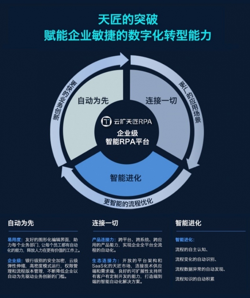 其间RPA生态建设上,云扩中心在树立三个生态圈: