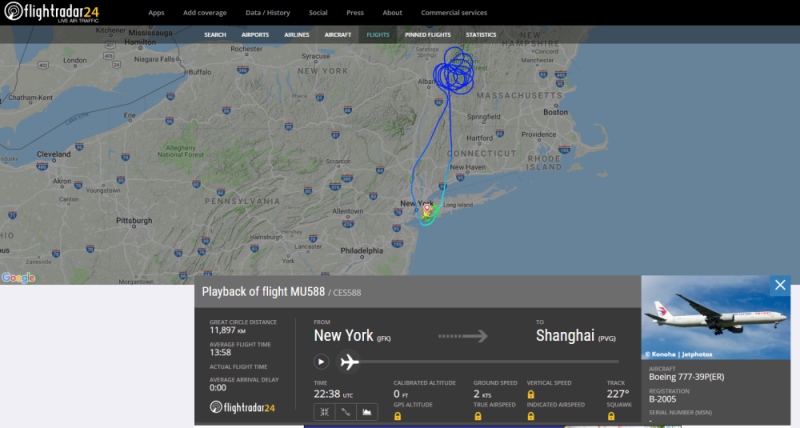 海外网8月13日电据航空追寻网站“flightradar24”显现,当地时间12日,一架中国东方航空从纽约肯尼迪国际机场飞往上海浦东国际机场的MU588航班客机,在起飞后不久,因不知道原因回来肯尼迪国际机场。