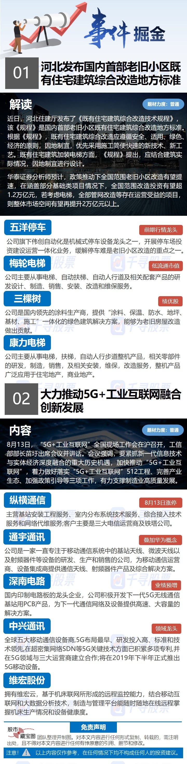 1、老旧小区改造:近来,河北住建厅发布了《既有住所修建归纳改造技术规程》,华泰证券分析师估计,全国范围改造出资有望超1.2万亿元,相关企业有望获益;