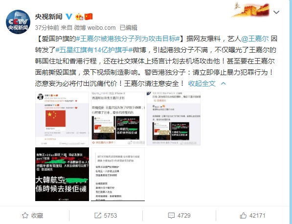 据央视新闻微博报导,网友爆料,演员@王嘉尔 因转发了#五星红旗有14亿护旗手#微博,引起港独分子不满,不只曝光了王嘉尔的韩国住址和香港行程,还在交际媒体上扬言计划去机场进犯他!乃至要在王嘉尔面前撕毁国旗,录下视频制作影响。正告港独分子:请当即中止暴力犯罪行为!为所欲为必将支付悲痛价值!王嘉尔请注意安全!
