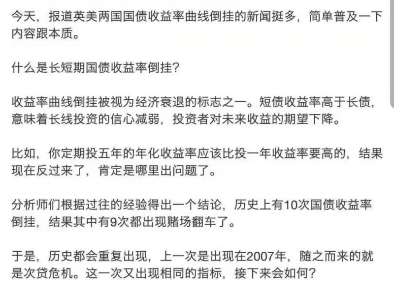 5、要害美债收益率曲线倒挂,30年美债收益率创纪录新低。数据显现,美国30年期国债收益率当地时刻14日被推至前史新低,10年期国债收益率自2007年以来初次低于两年期国债收益率。别的一个备受重视的目标——3个月期与10年期国债收益率“倒挂”的状况现已继续了两个多月。在欧洲,英国国债商场也呈现了相似状况:10年期国债收益率同日跌落至0.45%,而两年期国债收益率打破0.48%。