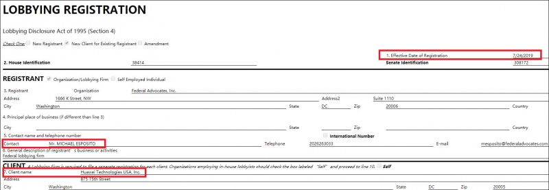 依据美国参议院网站发布的信息,华为美国分公司在7月24日正式将迈克尔·埃斯波西托(Michael Esposito)登记为该公司的说客。
