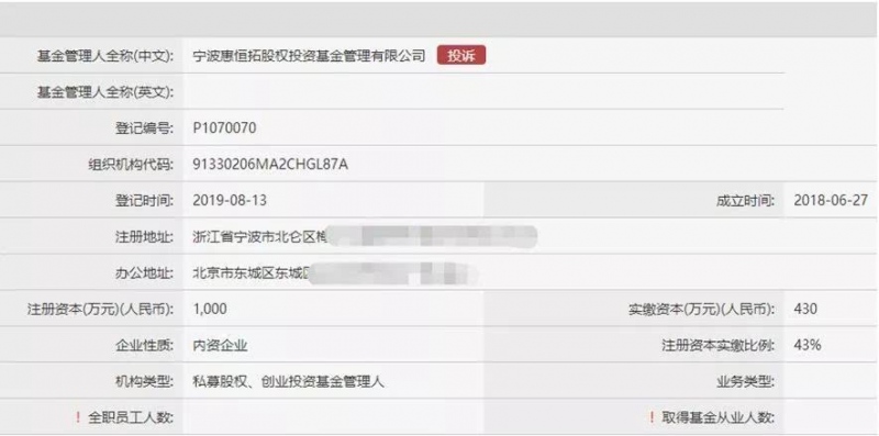 基金业协会信息显现,一家名叫“宁波惠恒拓股权出资基金办理有限公司”的出资安排在本年8月13日完结私募办理人挂号,类型是私募股权、创业出资基金办理人,该公司建立于2018年6月27日,注册本钱1000万,实缴43%。