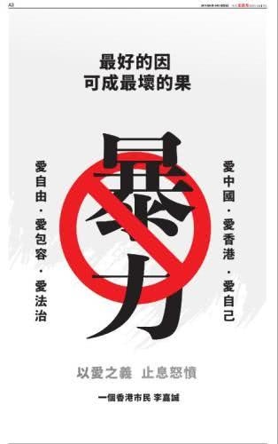 在8月16日的香港《文汇报》声明中,正中间为一个阻止暴力的图标,左边写着“爱自在·爱容纳·爱法治”,右侧写着“爱我国·爱香港·爱自己”。正上方的标题则为“最好的因 可成最坏的果”,下方写有“以爱之义 止息怒愤”,署名为“一个香港市民 李嘉诚”。