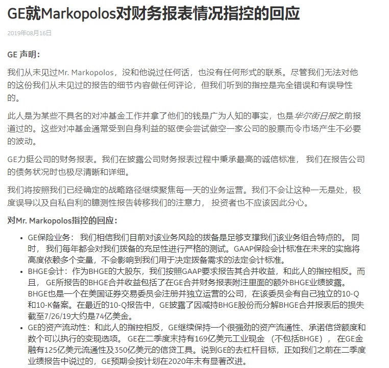 8月16日,GE我国发声明回应“财政造假”称,从未见过Mr. Markopolos,没和他说过任何话,也没有任何方式的联络。虽然咱们无法对他的这份咱们从未见过的陈述的细节内容做任何谈论,但咱们听到的指控是彻底过错和有误导性的。