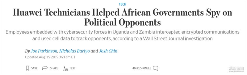 《华尔街日报》14日撰文,宣称华为使用公司技能、产品,“帮忙”乌干达、赞比亚、津巴布韦三国政府“监控各自政治对手”。