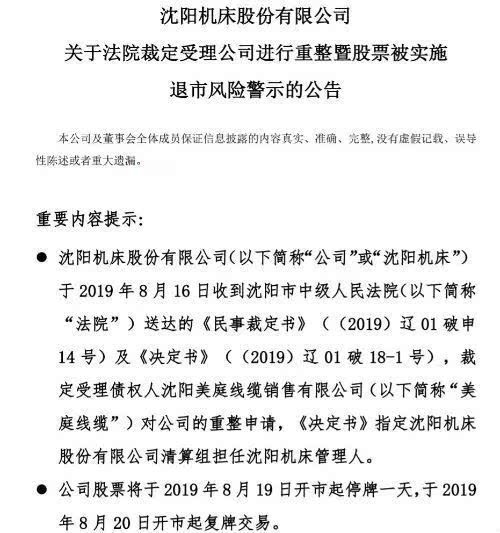 回溯前史布告可知,7月13日沈阳机床接连发表的多则布告,将公司控股股东沈机集团以及公司因缺少债款清偿才能被债款人请求重整的为难露出出来。其间,沈阳美庭线缆出售有限公司(以下简称“美庭线缆”)以沈阳机床不能清偿到期债款、显着缺少清偿才能,契合重整条件为由,向法院请求公司进行重整。依据美庭线缆催收函,到2019年5月20日,沈阳机床尚欠美庭线缆合同金钱441.44万元。8月16日沈阳机床收到沈阳市中级人民法院送达的《民事裁决书》及《决定书》,裁决受理债款人美庭线缆对公司的重整请求,《决定书》指定沈阳机床清算组担任沈阳机床管理人。