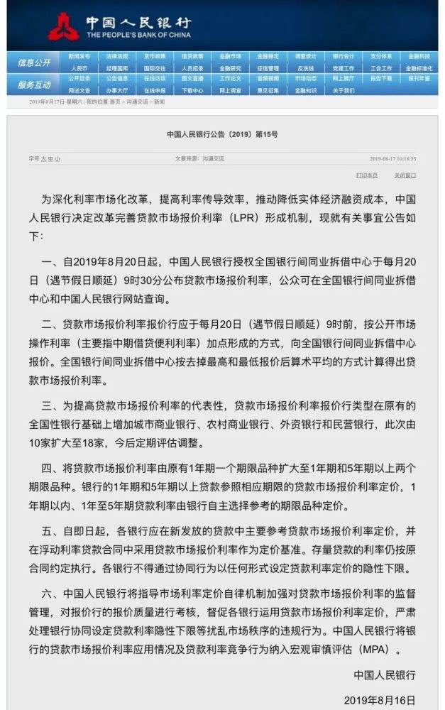 8月17日上午,人民银行发布布告,发布借款商场报价利率(LPR)构成机制变革的更多细节,新的LPR报价方法将与8月20日起正式施行,20日起各银行在新发放的借款中首要参阅LPR定价,并在起浮利率借款合同中选用LPR作为定价基准。这对新发放的借款来说,无疑将会利于借款实践利率的下降,到达“降息”的作用。