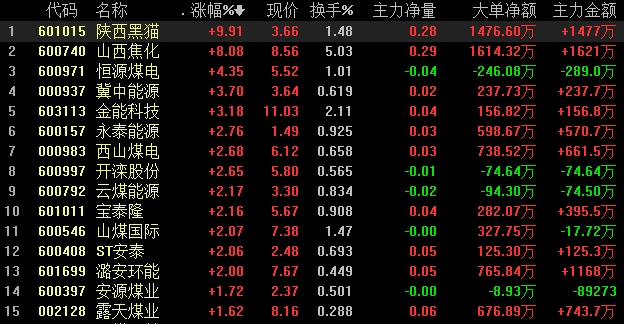 8月20日,煤炭板块大幅拉升,盘中继续强势,到发稿,陕西黑猫涨停,山西焦化涨超8%,冀中动力涨超4%,永泰动力、山煤世界、云煤动力等股价跟从拉升。