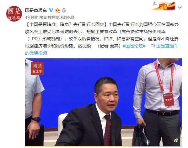 【我国是否降准、降息?央行副行长回应】我国央行副行长刘国强今天在国新办吹风会上承受记者采访时表明,短期主要看变革(完善借款商场报价利率(LPR)构成机制),变革今后看情况,降准、降息都有空间,可是降不降还要依据经济增加和物价局势。戳视频!(记者 夏宾)