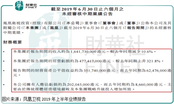 详细看,凤凰卫视2019年上半年完成运营总收入约为14.6亿元(人民币,下同),同比削减10.6%;运营亏本约为4.2亿元,较去年同期上升321.8%,股东持有人应占亏本约为1.8亿元,去年同期亏本约为0.07亿元。