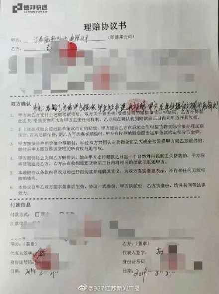 德邦快递弄丢毕业证学位证德邦寄丢毕业证仅赔3倍运费【最新后续:德邦赔了!不止三倍快递费!】本年3月24号,宿迁赵先生的女儿经过德邦快递寄行李,毕业证学位证被弄丢丢掉上万元,成果苦苦追讨五个月,对方只肯赔3倍运费。“我苏特报”报导之后,8月21号晚上,德邦快递向丢掉快递的赵先生父女抱歉,并与他们达成了补偿协议,照价补偿20000丢掉物品丢掉,并对毕业证和学位证的丢掉另行经济补偿。(我苏特报记者 范志凯)