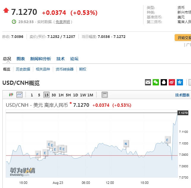 腾讯财经讯 8月23日晚间音讯,离岸人民币兑美元跌幅扩展至0.53%,报7.1270,日内价值降低近400点。