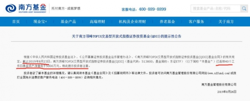 中日ETF互通项目这才多久,某中日ETF就发布提示性布告:截止8月23日,该基金已接连40个工作日基金财物净值低于5000万元,特此提示出资者留意。