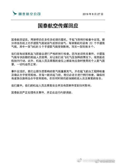 【作死!国泰航空客机氧气瓶被排气 ,谁还敢坐?】近期国泰航空负面不断,被认为是“反面教材”。今天,国泰航空再曝严重问题,引起重视。两架停靠在多伦多机场的客机,于起飞前例行查看中发现,部分存放在机上的手提氧气瓶被排气或部分排气。不少网友表明恐惧,还有网友表明:网上都有它的职工在ins发了说要放氧气。