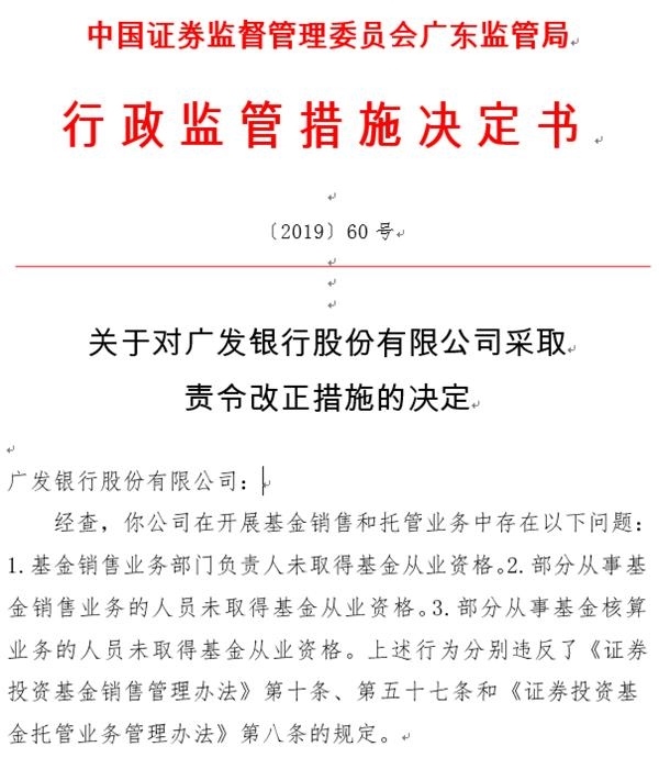 决定书显现,广发银行在在展开基金出售和保管事务中,存在基金出售事务部分负责人、部分从事基金出售事务的人员、以及部分从事基金核算事务的人员未获得基金从业资历的问题,上述行为别离违反了《证券出资基金出售管理办法》第十条、第五十七条和《证券出资基金保管事务管理办法》第八条的规则。