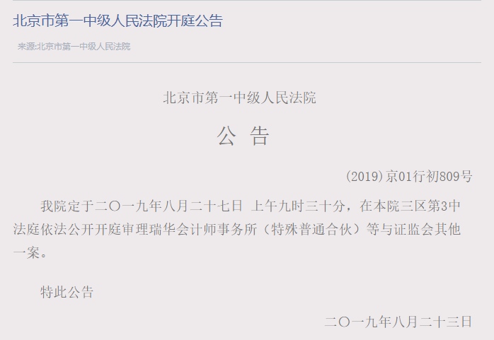 北京法院审判信息网开庭布告显现,瑞华不服证监会对*ST华泽一案的行政处分,把证监会告了,该案于8月27日在北京市榜首中级人民法院开庭审理。