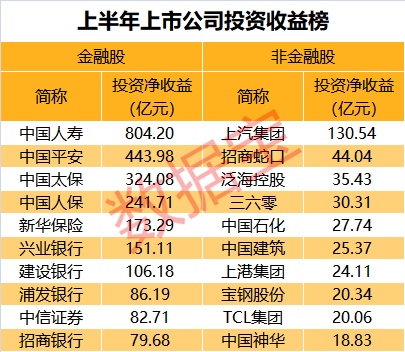 上半年57家公司出资赚超10亿,140家公司出资净收益超越净利润。