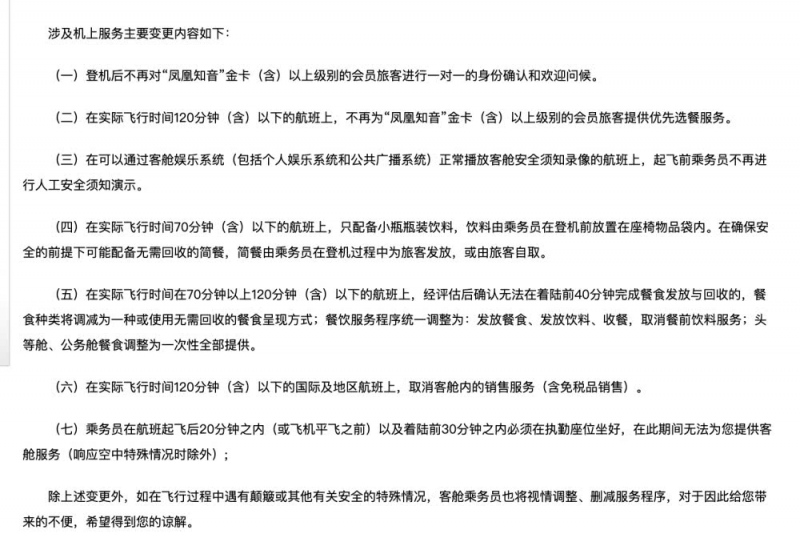 与此同时,以往国航航班上乘务员对“凤凰知音”金卡(含)以上等级的会员旅客进行的一对一身份承认和欢迎问好也会撤销,而且实践飞翔时刻120分钟(含)以下的航班上,国航也不再为“凤凰知音”金卡(含)以上等级的会员旅客供给优先选餐服务。