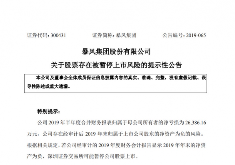 暴风集团称,依据《深圳证券买卖所创业板股票上市规矩》第13.1.1条第(三)项 “最近一个年度的财政会计陈述显现当年年底经审计净资产为负,深圳证券买卖所能够决议暂停其股票上市”的规则,若公司经审计的2019年度财政会计陈述显现2019年年底的净资产为负,深圳证券买卖所或许暂停公司股票上市。
