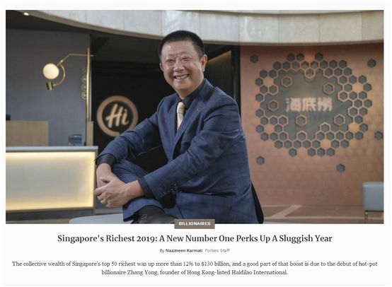 8月29日,《福布斯亚洲》杂志发布2019年新加坡富豪50强排行榜,海底捞老板张勇初次入榜,即以138亿美元(约合987亿元)身家,打败位居榜首10年的远东组织黄志吉祥黄志达兄弟,成为新加坡首富。