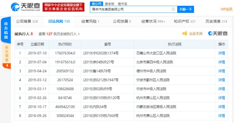 天眼查数据显现,青年轿车集团的法定代表人是庞青年,注册资本1亿元人民币。别的,青年轿车共有8条被实行人信息,自2019年来合计6条,累计实行标的超7.1亿。