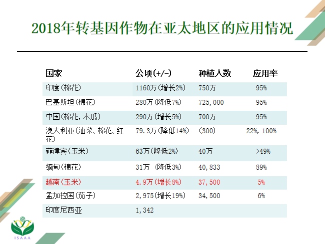 越南是2018年亚太区域17个正式运用转基因作物的国家/区域之一。其间,栽培国有9个,进口国/区域有8个。