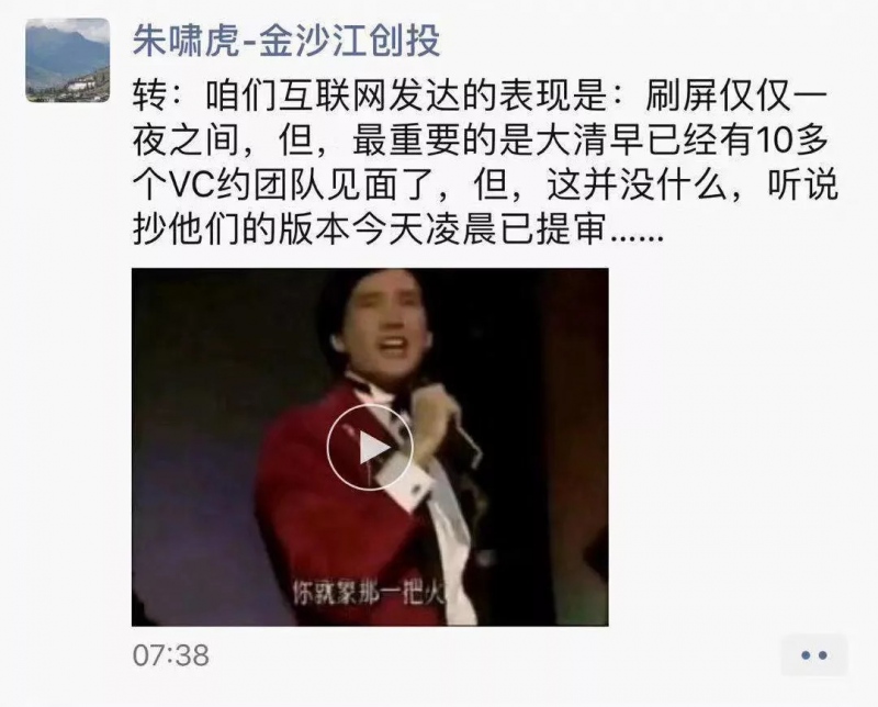 和以往大都现象级App相同,“ZAO”也引发了出资圈的注重,被称为出资界老炮的朱啸虎今早就发了一条朋友圈表明,现在现已有10多家VC自动约“ZAO”团队,一起仿照“ZAO”的开发者们现已把复制版运用提交审阅了。