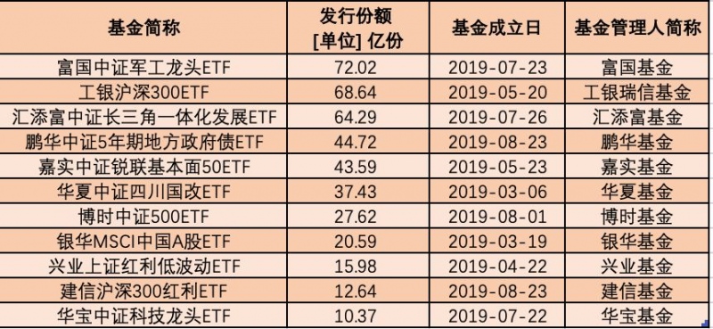 就单只基金来看,年内建立的ETF中呈现了多只首募规划超越50亿元的“爆款”产品。7月底建立的富国中证军工龙头ETF建立规划72.02亿元,是现在年内建立规划最大的股票型ETF。工银瑞信沪深300ETF、汇添富中证长三角ETF首募规划都超越60亿元。