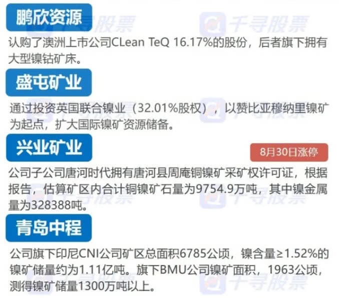 腾讯证券9月2日讯,有色镍板块开盘大涨,青岛中程涨停,盛屯矿业大涨9%,宁波联合、鹏欣资源、西部矿业集体高开,音讯面上,沪镍期货主力开盘涨停,涨幅6%。